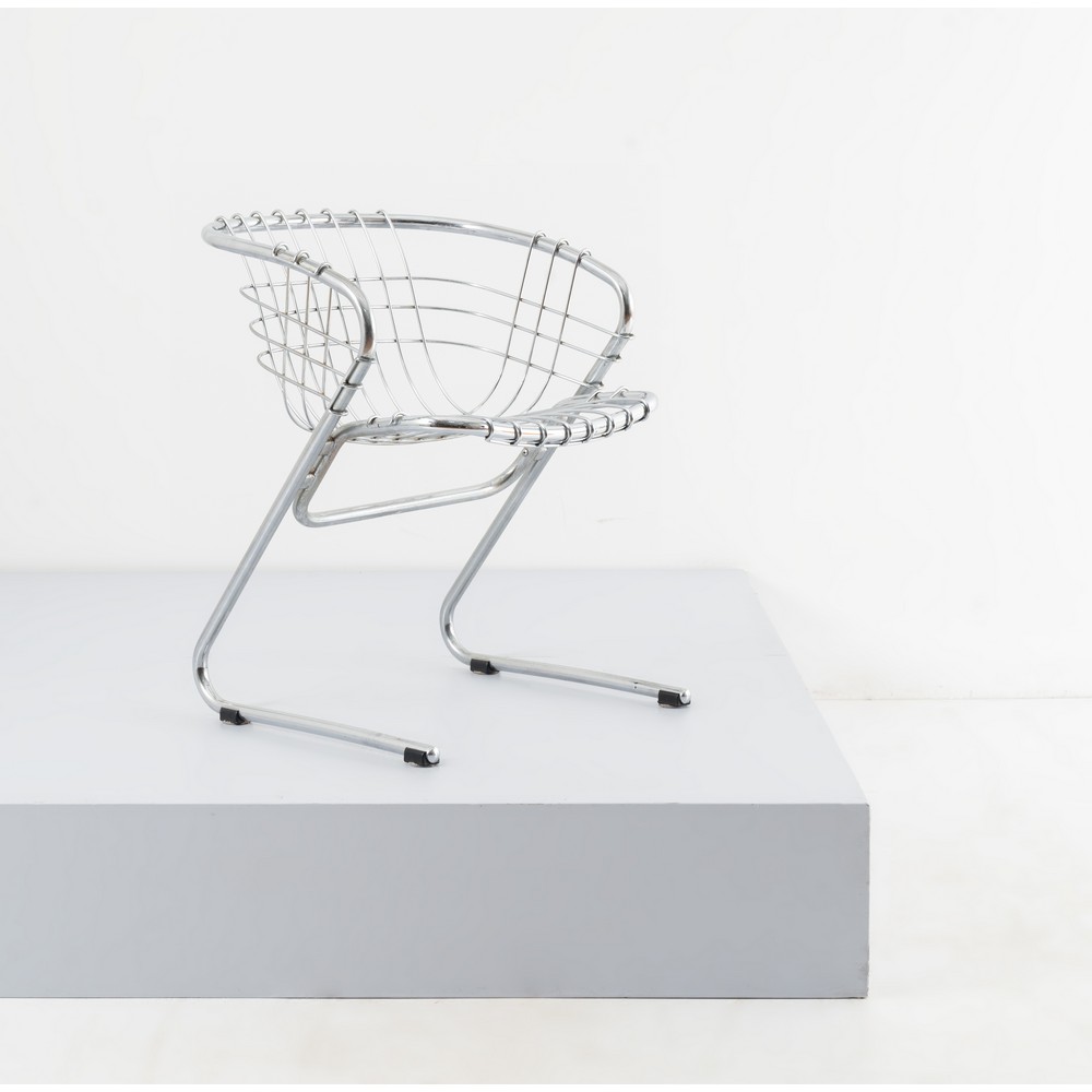 Poltrona modello "Flynn", struttura in tubolare di metallo cromato e curvato, spalliera e seduta in intreccio metallico. Segni di uso.