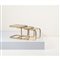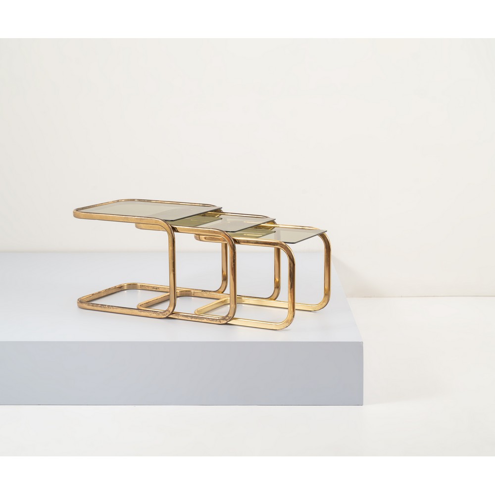 Tre tavoli impilabili da salotto con struttura in metallo dorato, fianchi curvati, piano rettangolare in vetro fumè. Segni di uso e graffi.