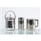Tre contenitori termici in metallo cromato, uno con corpo sagomato, manico rigido semicircolare, decori sui fianchi. Uno con corpo cilindrico. Uno con corpo cilindrico e manico laterale. Segni di uso. Marchio di produzione.