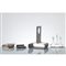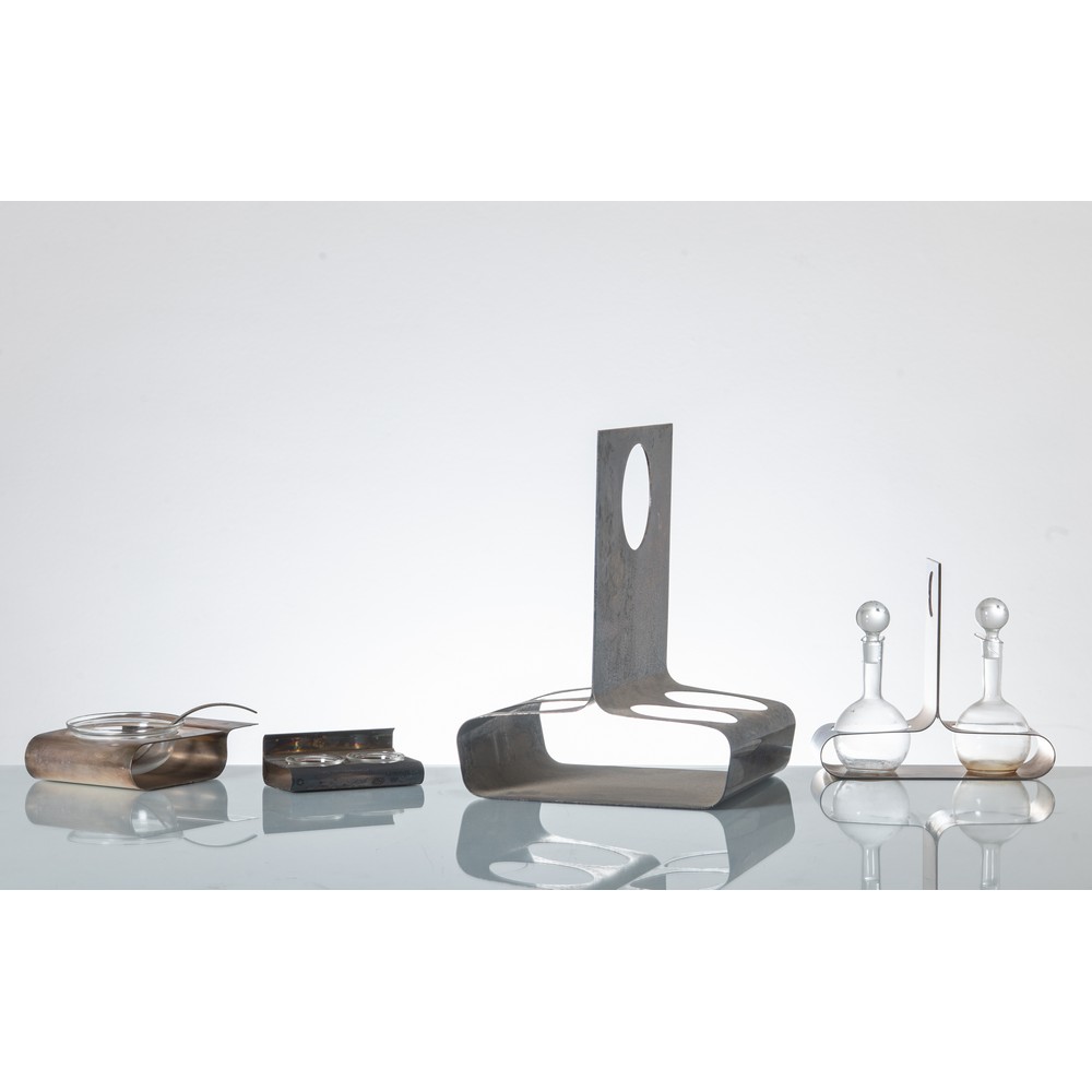 Quattro complementi tavola in metallo argentato e vetro composti da una formaggiera, un sale e pepe, un ménage con ampolle in vetro ed un portabottiglie da vino. Marchio di produzione.