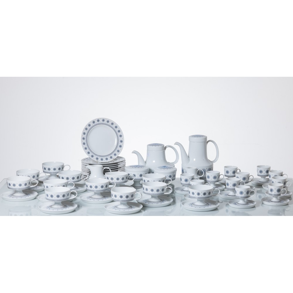 Servizio da the e caffè modello “EisBlume” in porcellana bianca decorata con fiori di ghiaccio grigio e blu, composto da caffettiera, teiera, due zuccheriere, lattiera e caraffina limone, dodici tazze the con piatto, undici tazze caffè con piatto, dodici piatti dessert. Marchio di produzione.