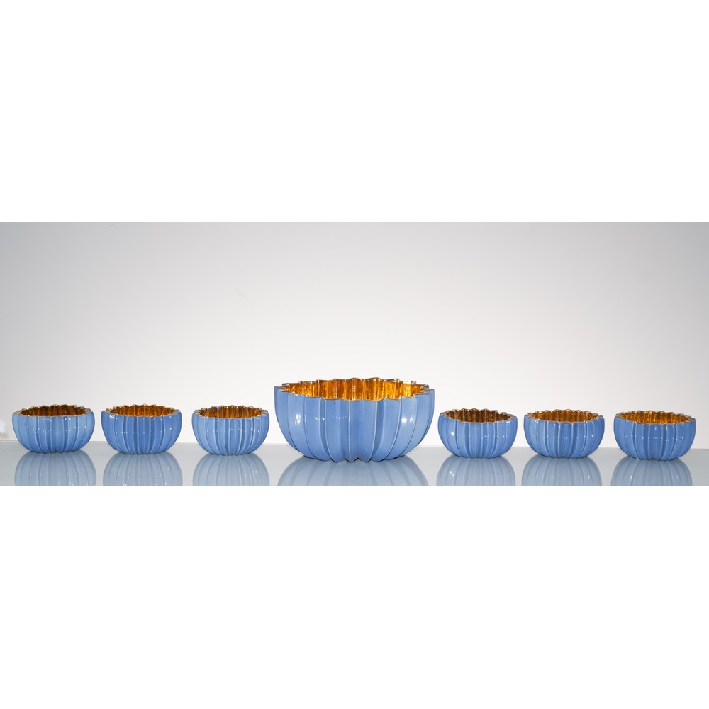 Servizio da macedonia in ceramica smaltata e dorata composto da una grande coppa e sei piccole coppe, corpo semi circolare scannellato, bocca circolare ondulata, doratura originale. Marchio di produzione. Lievi difetti.