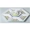 Antipastiera in ceramica bianca decorata a motivi floreali rosa, corpo esagonale composto da sei raviere ed un piatto centrale esagonale con coperchio sferico decorato con carciofo. Marchio di produzione e numero seriale.