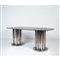 Tavolo da pranzo con due sostegni cilindrici a base circolare in metallo cromato, piano ovale in vetro trasparente fumè. Segni di uso.