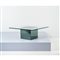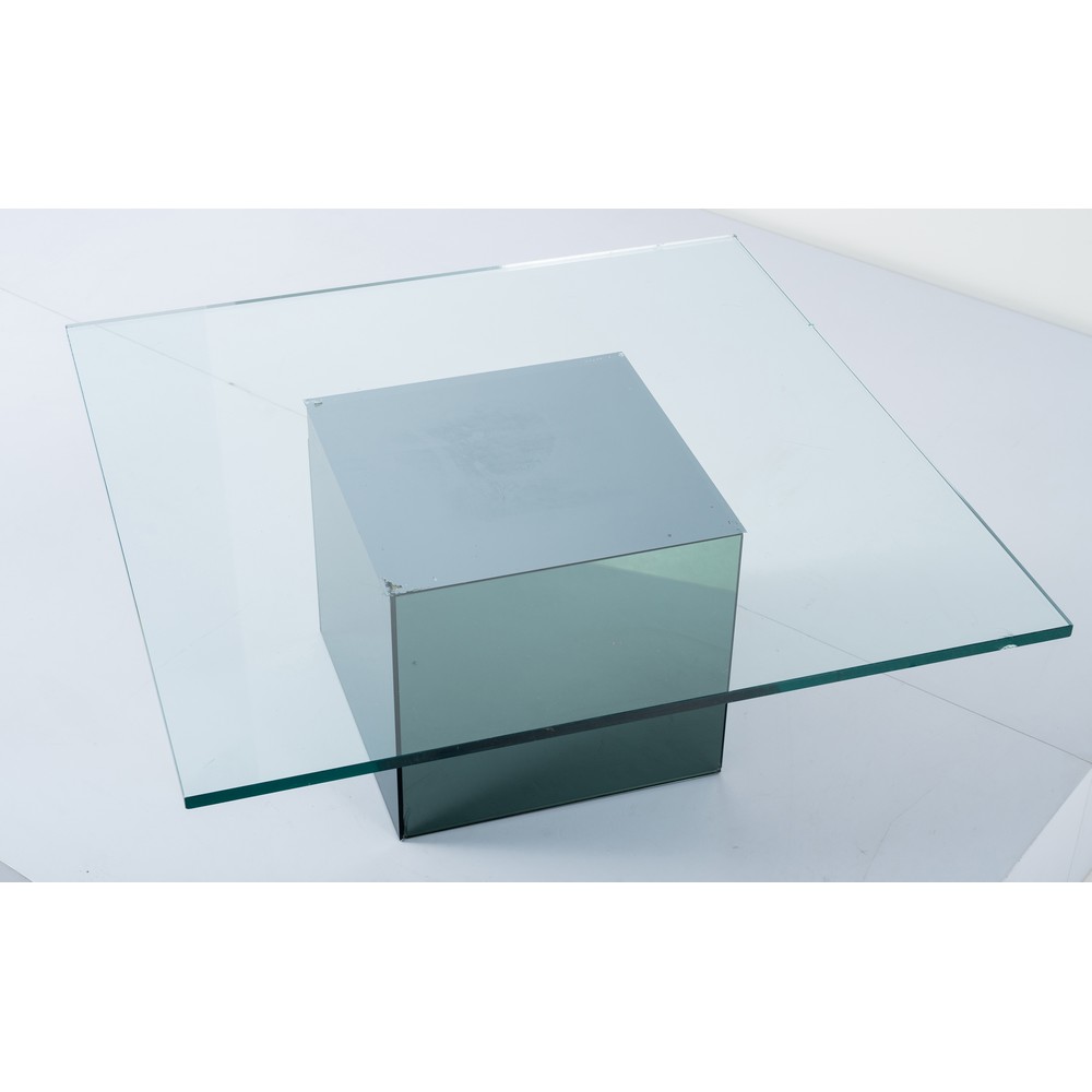 Tavolo basso modello “Block” struttura in truciolato di legno con vetro specchiato, piano quadrato in cristallo molato. Etichetta della produzione. Sbeccatura al piano.