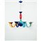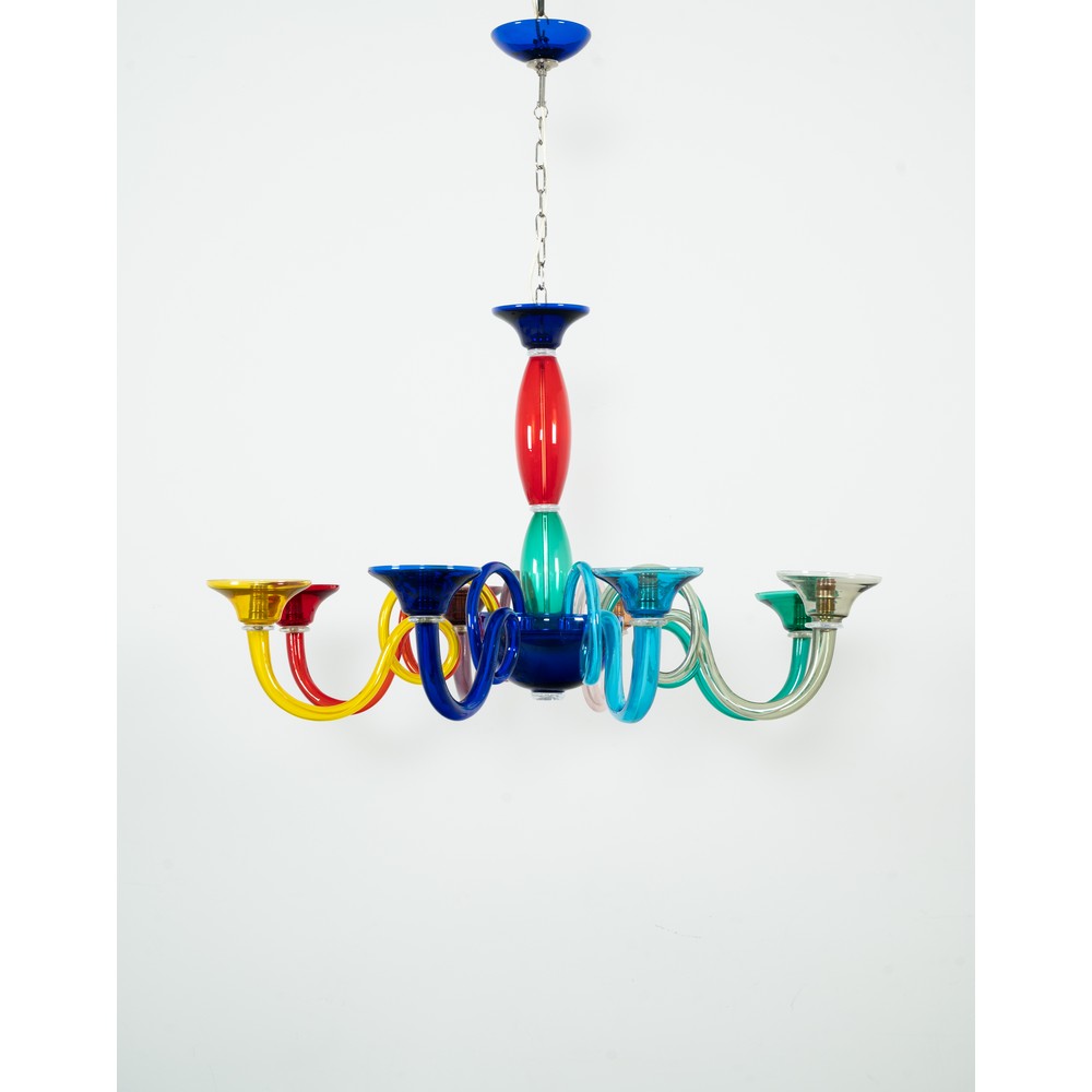 Lampada a sospensione ad otto luci, struttura in metallo cromato otto bracci curvati con coppa terminale ognuno di colore differente, fusto in vetro blu, rosso e verde. Una mancanza nella coppa inferiore.