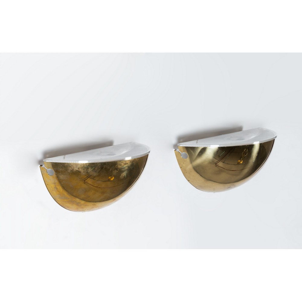 Coppia di lampade da parete modello "Quarto", con diffusore a quarto di globo in ottone e policarbonato. Marchio di produzione.