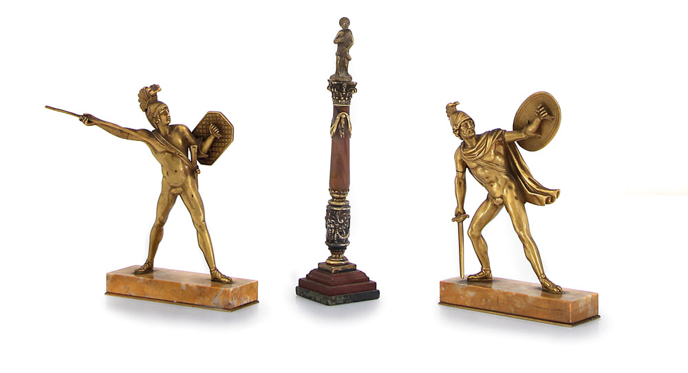 TRE SCULTURE IN BRONZO DORATO E MARMO, FINE XIX SECOLO, una coppia di gladiatori e una colonna con fusto in pietra dura cimata da figura; difetti e sbeccature.