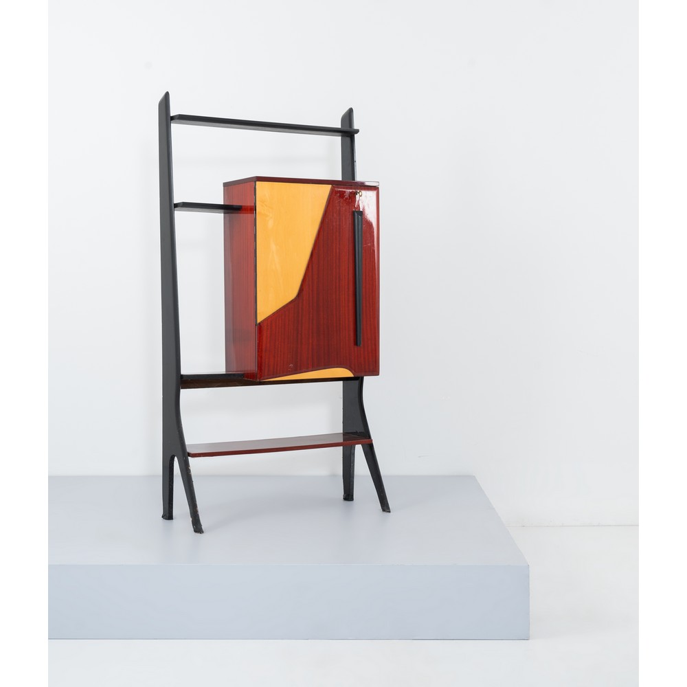 Mobile bar in legno esotico ed ebanizzato, sul fronte un vano bar chiuso con anta a ribalta, con fondo in cristallo specchiato mensola in vetro incolore, fianchi sagomati, mensole d’appoggio. Minuterie in metallo. Segni di uso.