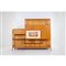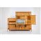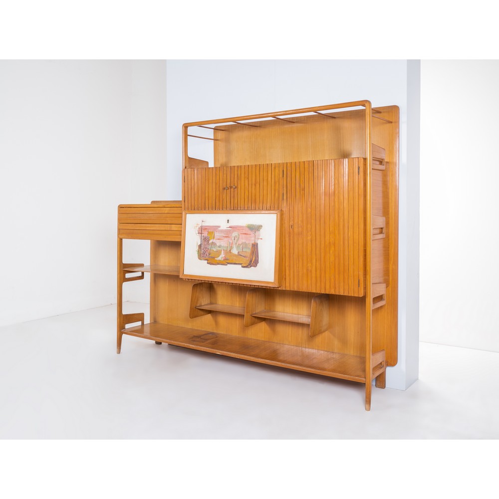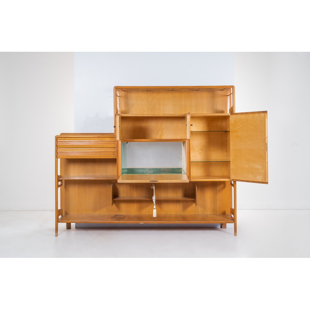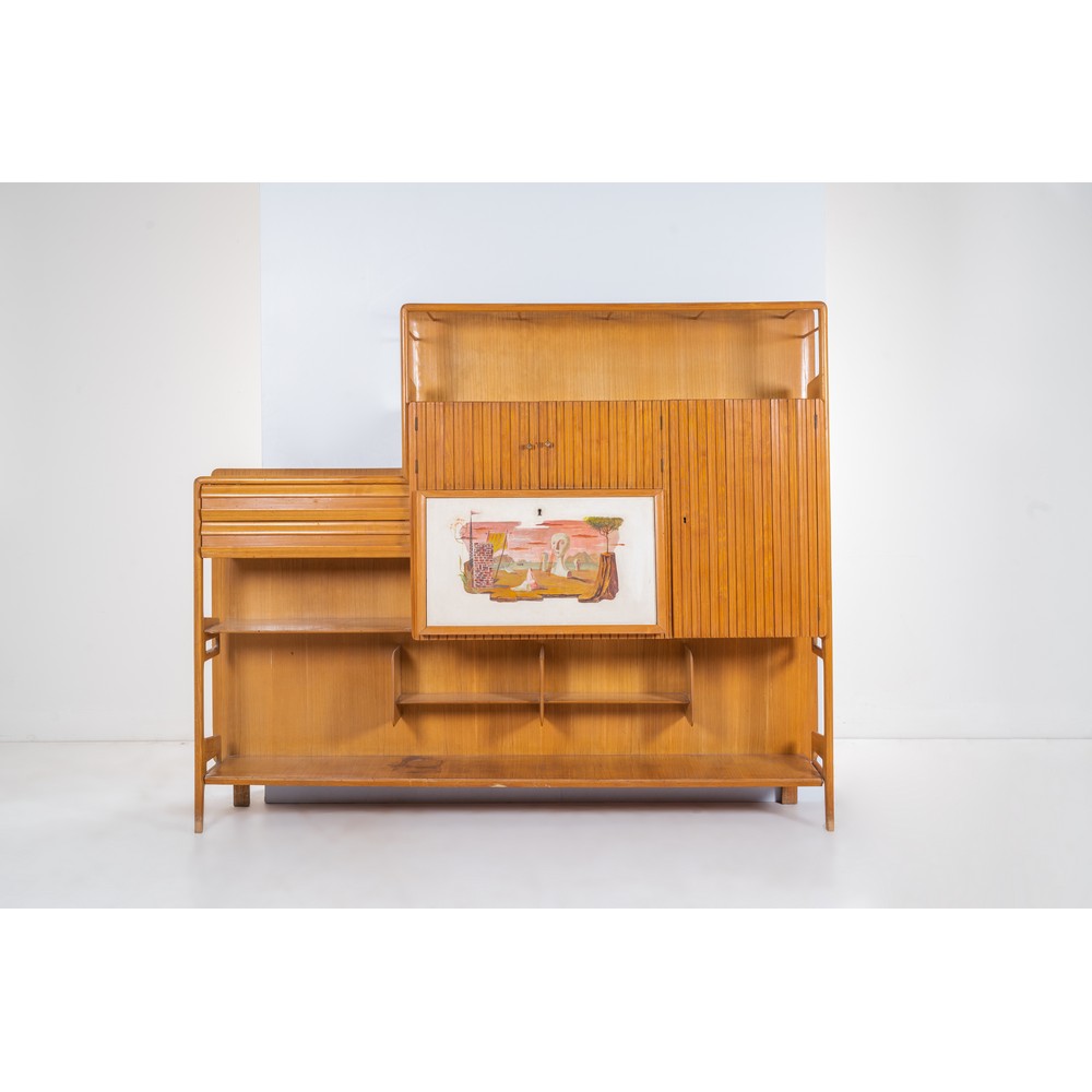 Mobile a scomparti in legno di faggio sostenuto da montanti lievemente sagomati, sul fronte un vano chiuso con due ante battenti con finitura in legno cannettato, un vano con due mensole in vetro e chiuso con anta battente con finitura in legno cannettato, un vano bar con interno specchiato e chiuso con anta a ribalta decorata con scena surrealista, due cassetti e mensole. Usure.