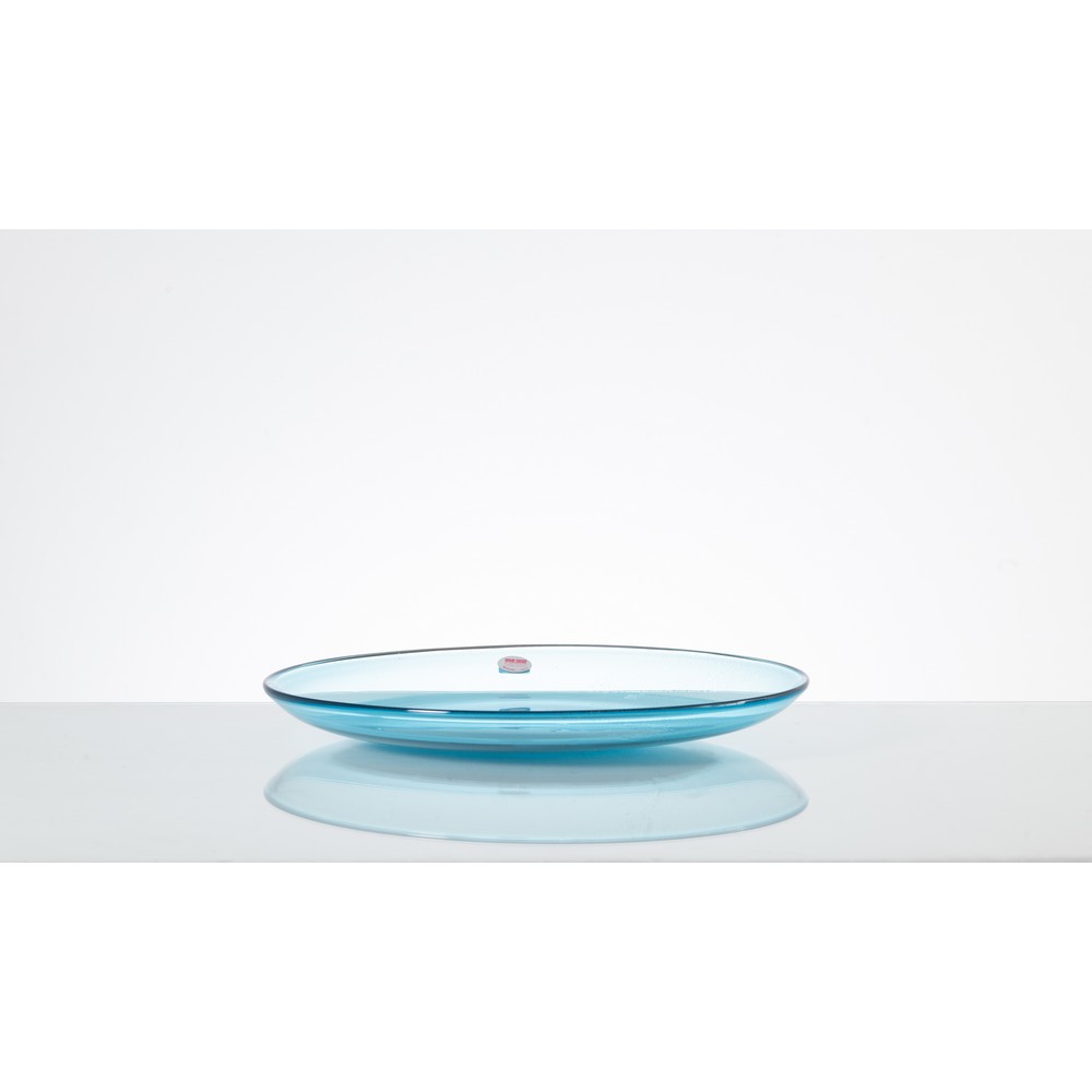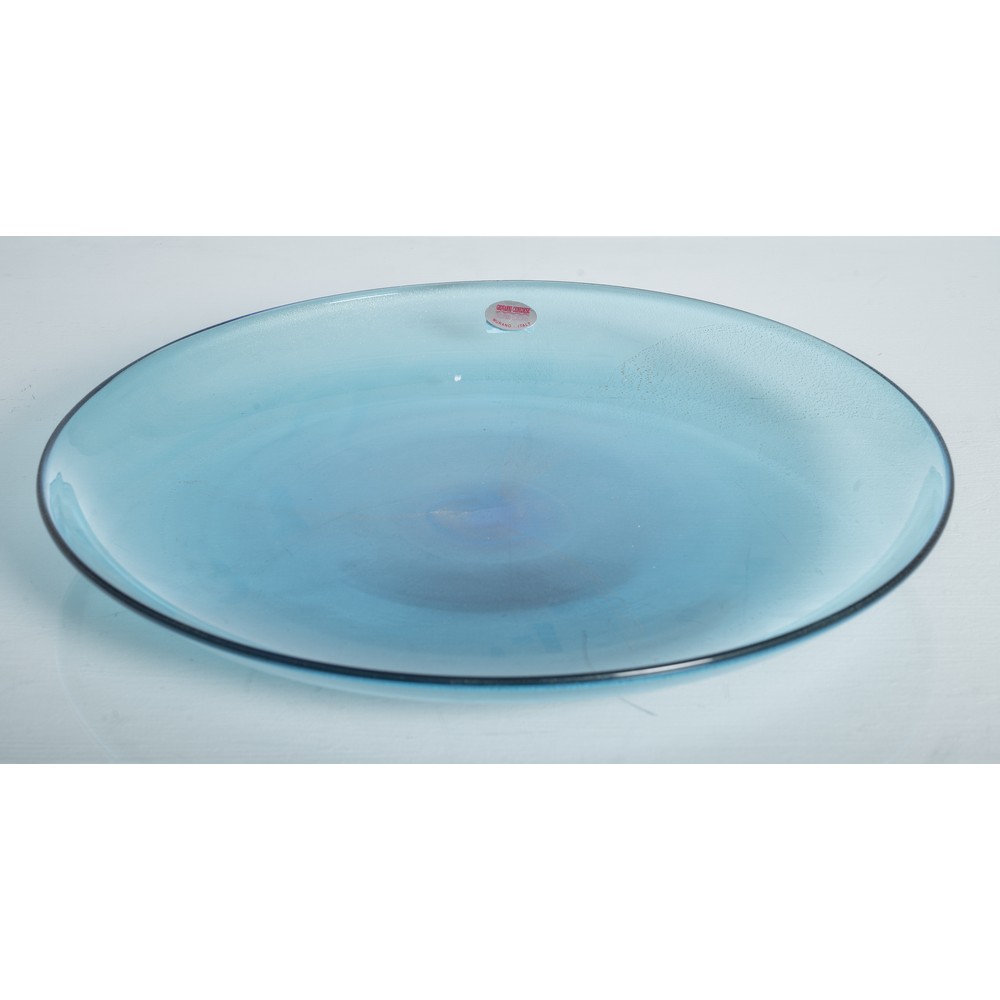 Grande piatto in vetro azzurrino decorato con velature in oro, corpo circolare Firma a graffio.