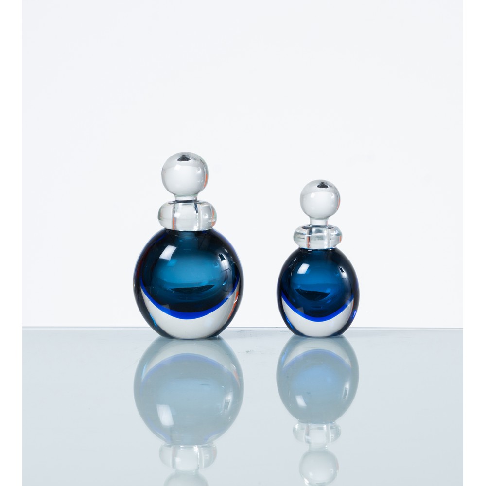 Due bottiglie di grandezza differente in vetro sommerso incolore, blu elettrico e blu, corpo e tappo sferici.