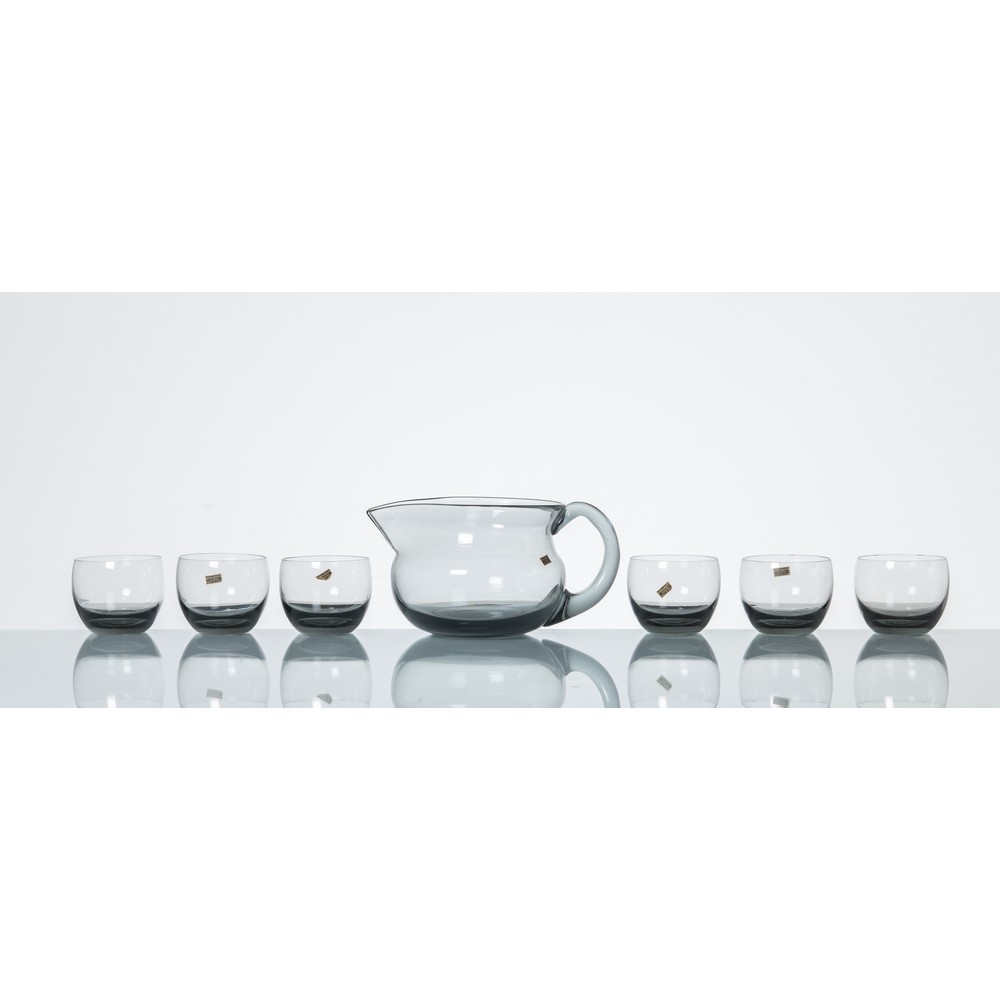 Servizio di bicchieri in vetro fumè composto da sei bicchieri sferici ed una brocca. Etichetta di produzione.