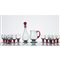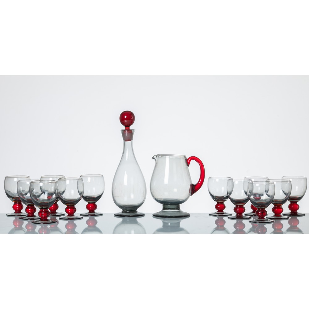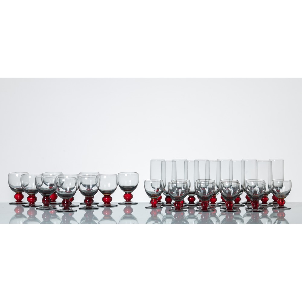 Servizio di bicchieri a calice in vetro fumè e rosso, composto da una caraffa, una bottiglia con tappo, dodici bicchieri acqua, dieci bicchieri vino, undici flutes, dieci bicchieri liquore.