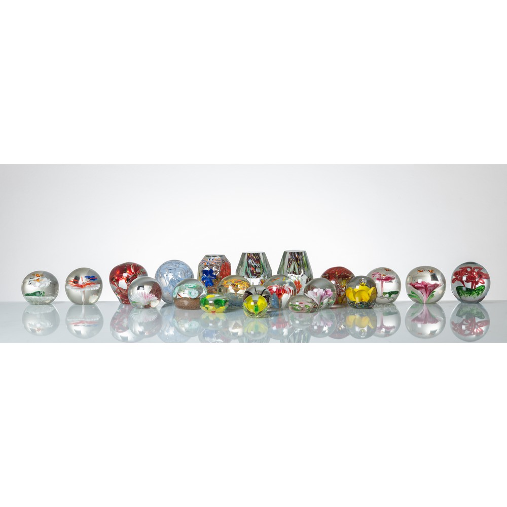 Collezione di ventuno fermacarte in vetro incolore sommerso con decorazioni policrome e forme differenti.