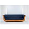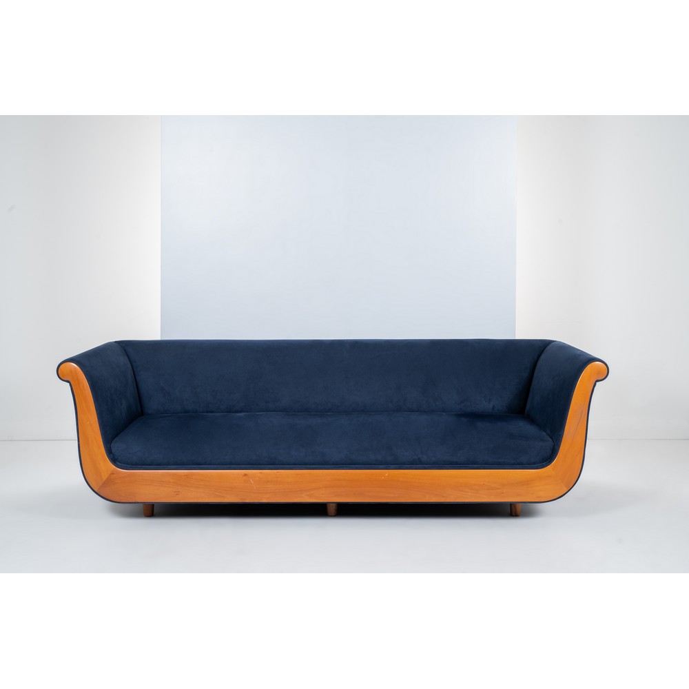 Divano modello “Prima Fila”, disegno originale per il teatro Carlo Felice, struttura sagomata in legno di noce, spalliera e seduta con imbottitura e rivestimento in tessuto blu. Segni di uso.