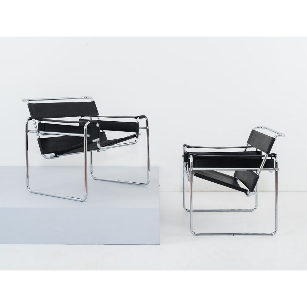 Coppia di poltrone, riedizione del modello "B3" o "Wassily", struttura in tubo di acciaio cromato e cuoio di colore nero. Segni di uso.