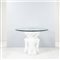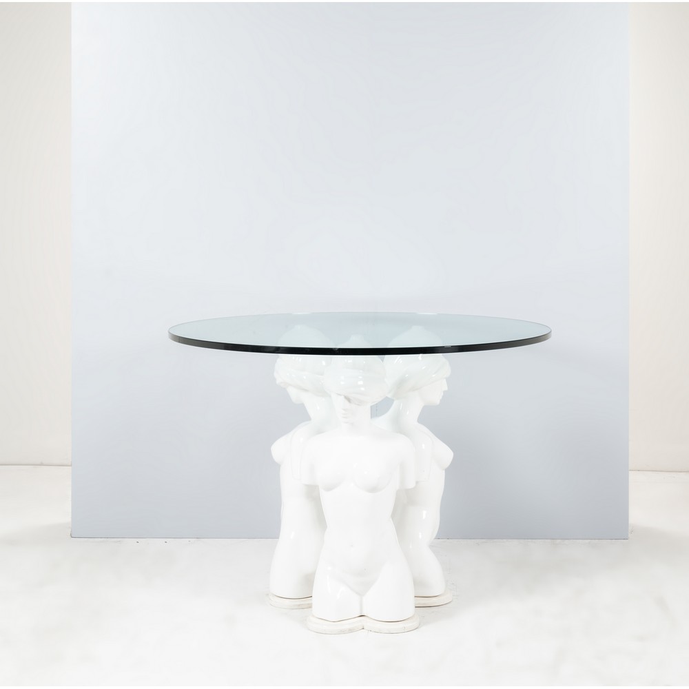 Tavolo con sostegno in ceramica smaltata composto da tre busti di figure femminili, piano circolare in vetro di grosso spessore incolore. Firma.