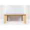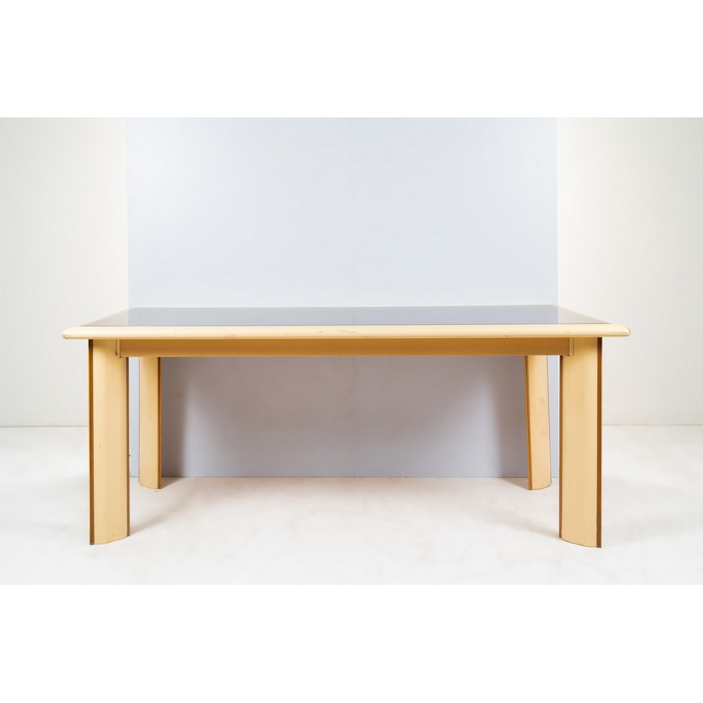Tavolo da pranzo in legno laccato avorio, piano rettangolare con inserto incassato di vetro fumè, gambe laccate e bordate in legno. Segni di uso.