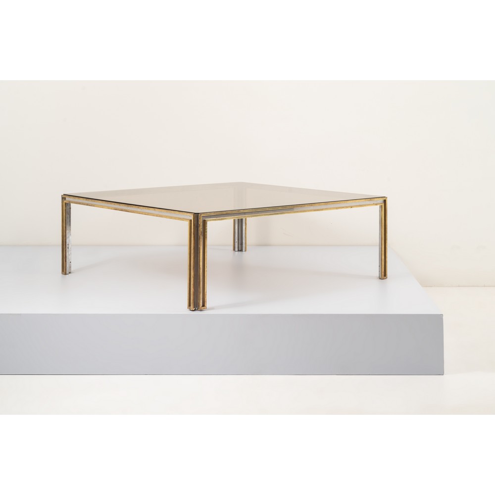 Grande tavolo da salotto con struttura in metallo cromato ed ottone, piano quadrato in vetro fumè.