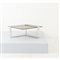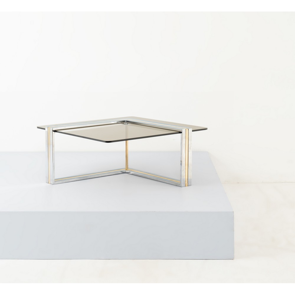 Tavolo da salotto con struttura in metallo cromato e metallo dorato, piano in vetro fumè, angoli arrotondati.