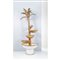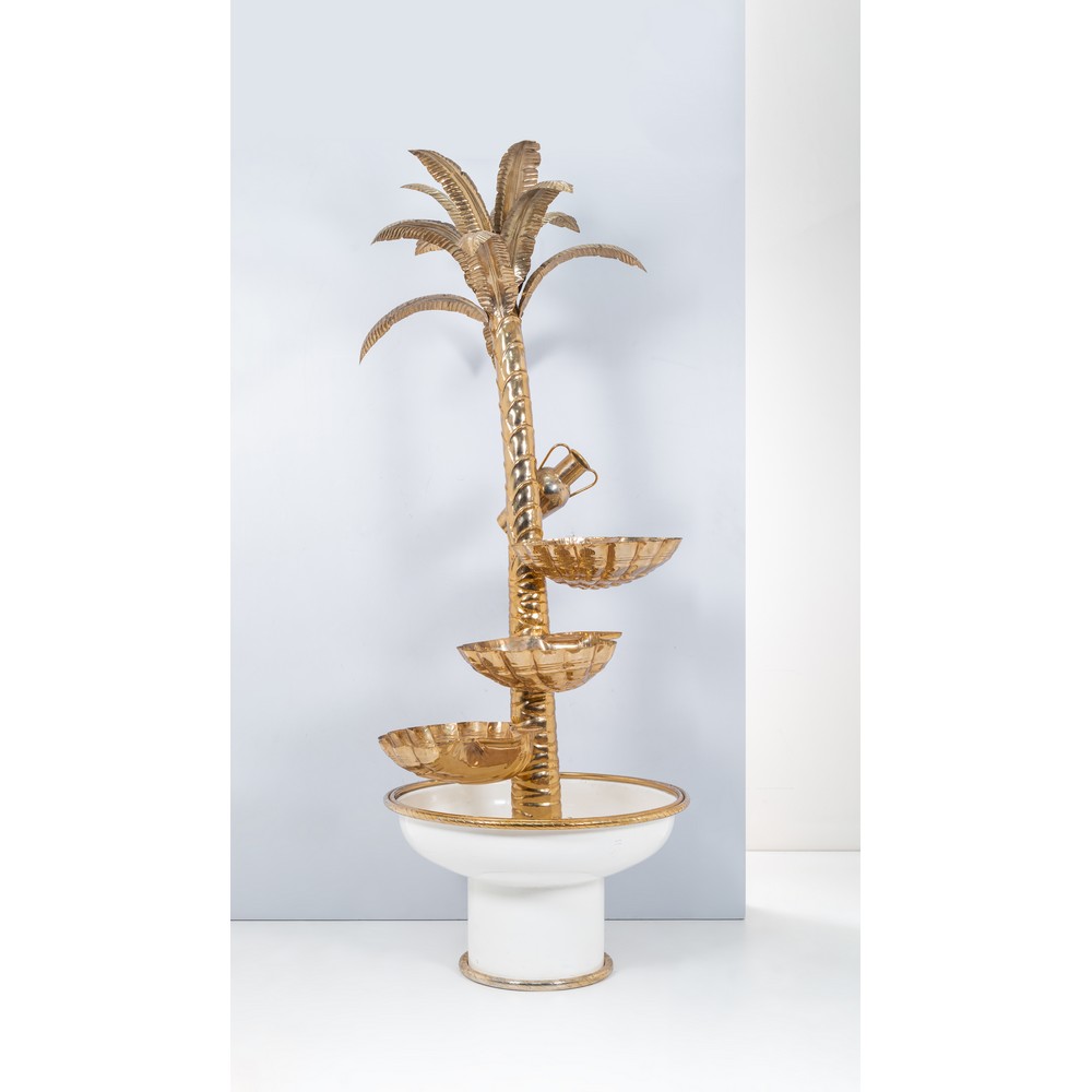 Fontana in ottone e metallo smaltato, corpo centrale a palma con giara e tre conchiglie, vasca semicircolare, motore per ricircolo d’acqua.