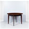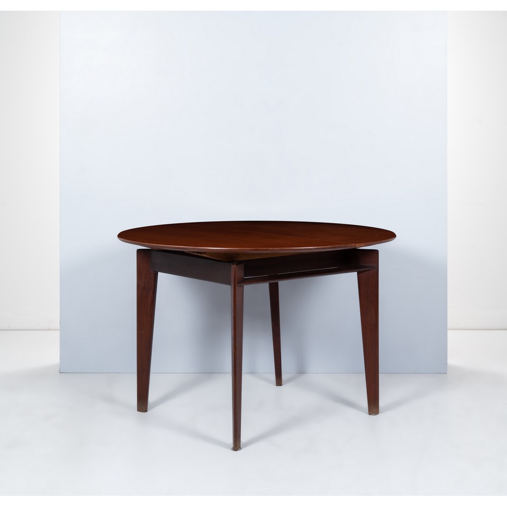 Tavolo da pranzo con piano circolare allungabile mediante prolunghe interne a scomparsa, base in legno di faggio tinto e piano in legno impiallacciato teak. Lievi usure.