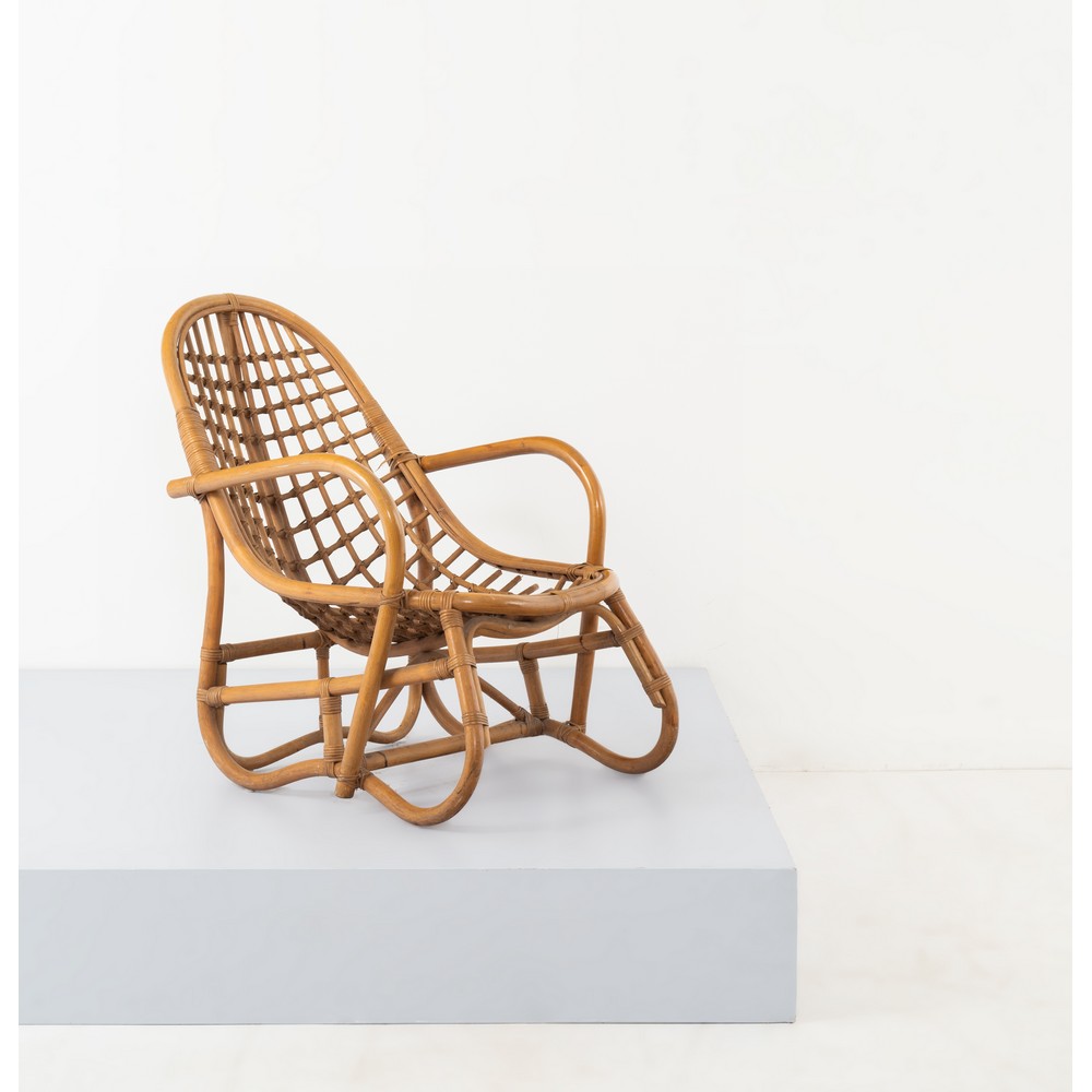 Poltrona con struttura in canna di bamboo curvata a vapore, spalliera e seduta ad intreccio.