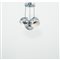 Lampada a sospensione a tre luci, composta da tre diffusori semisferici in metallo cromato, cavo nero, coppa circolare in metallo cromato.