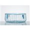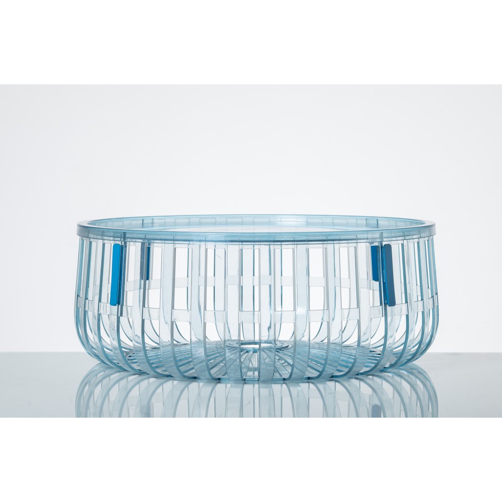 Cesto contenitore o tavolo occasionale modello “Panier”, quattro moduli a spicchi di circonferenza che uniti danno forma ad un solido circolare in policarbonato azzurro con coperchio circolare. Marchio di produzione.