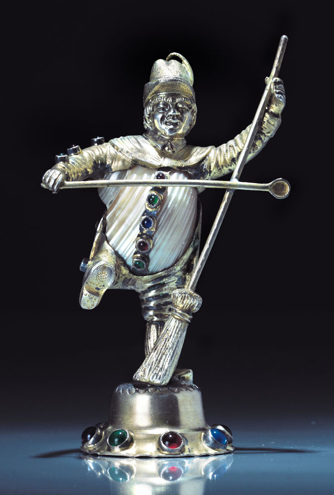 FIGURETTA IN ARGENTO VERMEIL, MADREPERLA E APPLICAZIONI VITREE, AUSTRIA, INIZIO XX SECOLO, maschile con cabochon policromi a decoro.