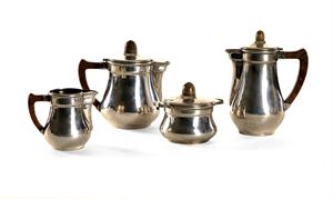 SERVIZIO IN ARGENTO Servizio in argento composto da: caffettiera, teiera, zuccheriera, lattiera di gusto neoclassico. Manici in legno Periodo inizio XX sec. Peso gr.1.614 Silver Service includes: coffee, tea pot, sugar bowl, milk jug neo-classical style. Wooden handles Period early twentieth century. weight gr.1.614