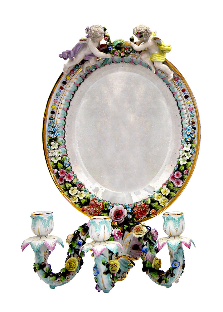 SPECCHIERA AD APPLIQUE IN PORCELLANA, DRESDA, XIX SECOLO, ovale a tre bracci con cornice a fiori applicati cimata da due amorini, decoro policromo e in oro; lievi restauri e sbeccature.