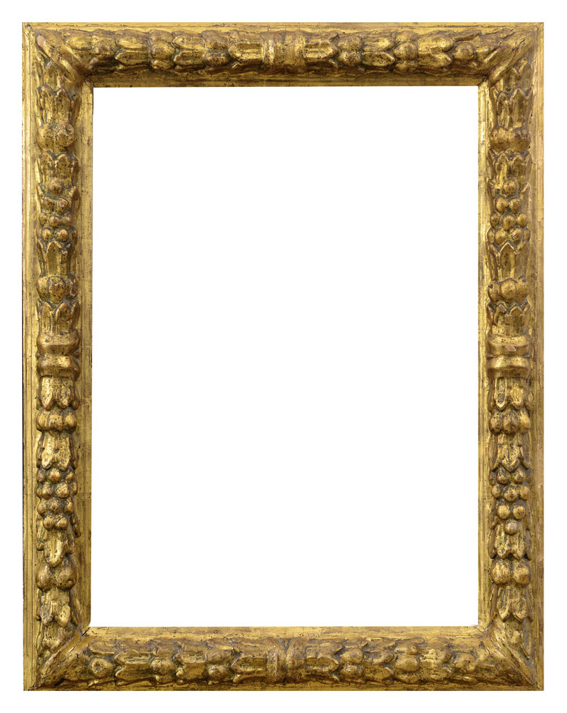 CORNICE IN LEGNO SCOLPITO E DORATO A MECCA, XVII SECOLO, intagli a frutti e foglie; usure.