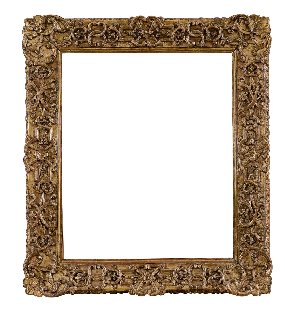 CORNICE IN LEGNO SCOLPITO E DORATO, FRANCIA, XVIII SECOLO, rettangolare con intagli a ramages e conchiglie; restauri.