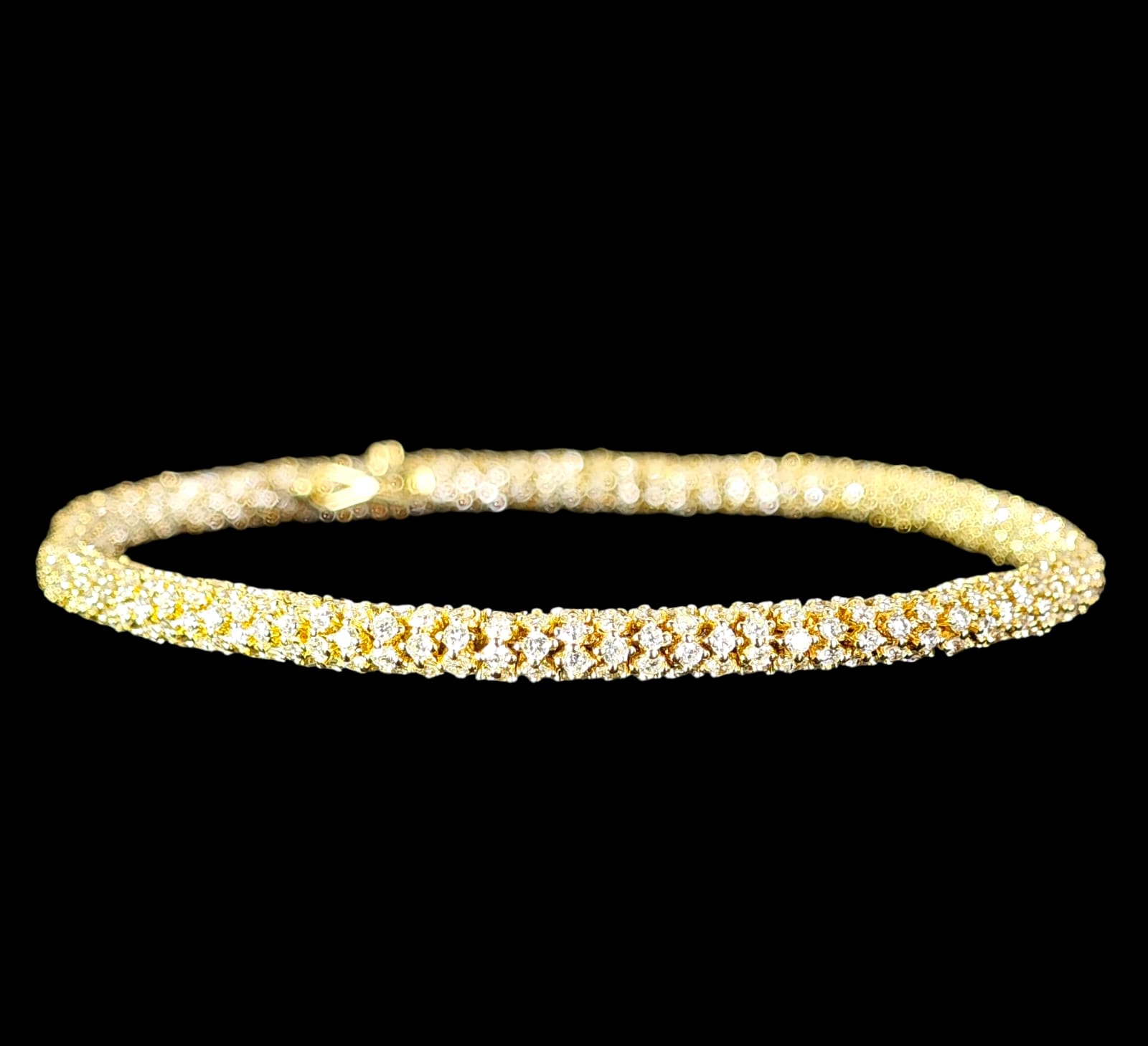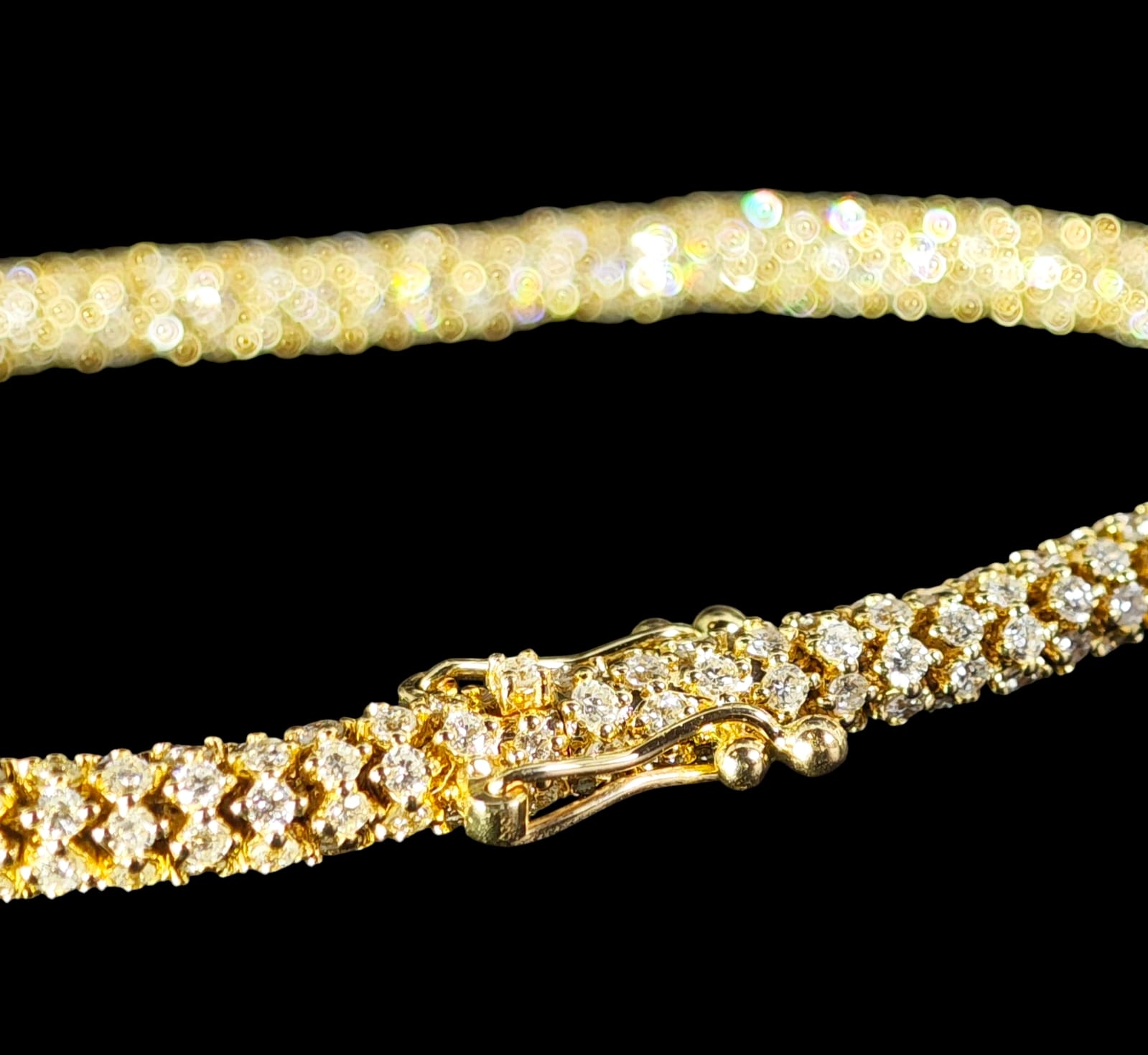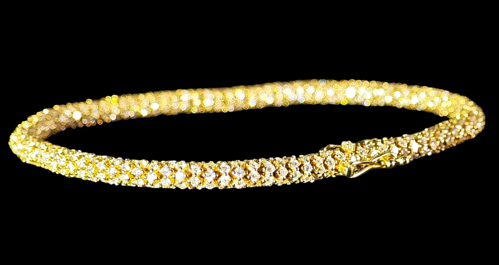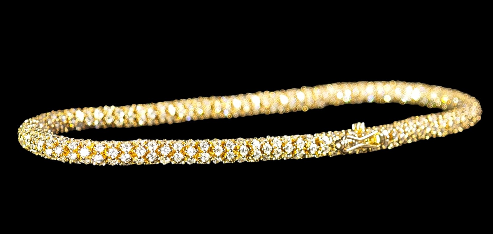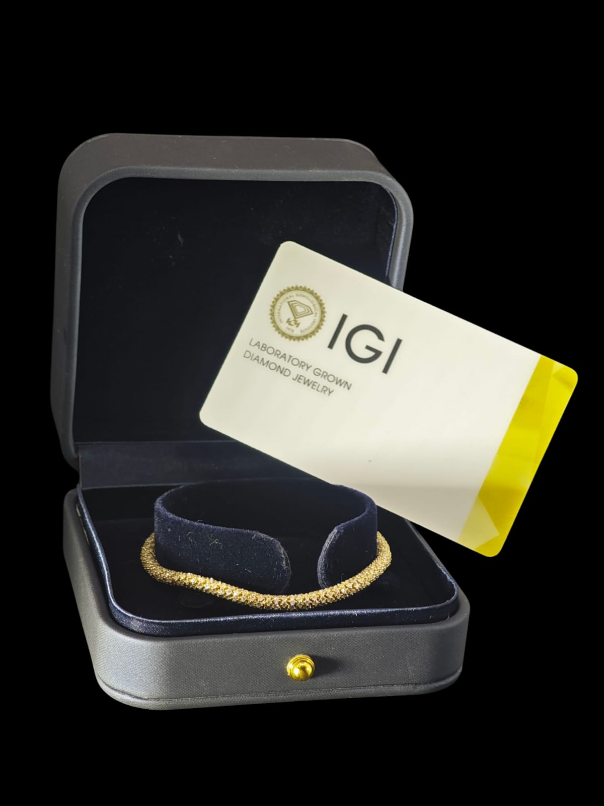Un bracciale in oro giallo 14K, certificato IGI, con un design flessibile interamente incastonato con 614 diamanti lab-grown taglio brillante rotondo, con un peso totale stimato di 6.78 carati. I diamanti presentano un colore D-F e una purezza VVS-VS. Il bracciale si chiude con una chiusura a scatola, chiaramente marcata "585", e include due fermagli di sicurezza. Lunghezza: circa 18.5 cm Peso: 11.28 grammi - COMMISSIONE D’ASTA 25%