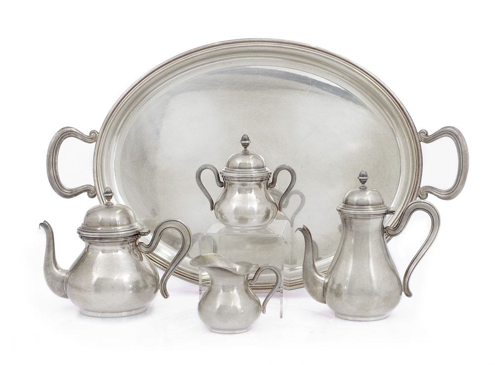 SERVIZIO DA TE' E CAFFE' IN ARGENTO, XX SECOLO, composto da teiera, caffettiera, lattiera, zuccheriera e vassoio ovale con manici.