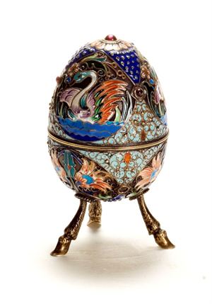 UOVO IN ARGENTO Uovo in argento Mosca 84zolotnik, interno dorato, interamente smaltato con motivi vegetali e cigni; poggiante su tre piedi a forma di zampa di caprone, epoca XX secolo