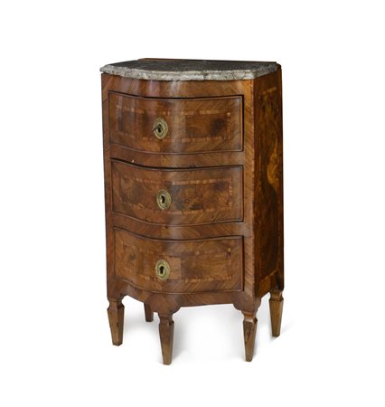 MOBILETTO LASTRONATO IN LEGNI VARI, XVIII SECOLO, fronte mosso a tre cassetti e piano in marmo; usure e sbeccature.