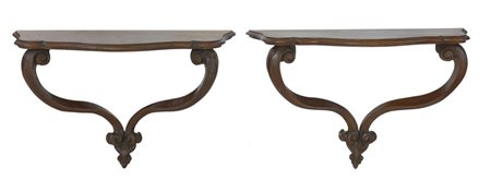 COPPIA DI CONSOLE AD APPLIQUE IN NOCE, XVIII SECOLO, a goccia con piani sagomati e montanti a volute; sostituzioni, usure e sbeccature.