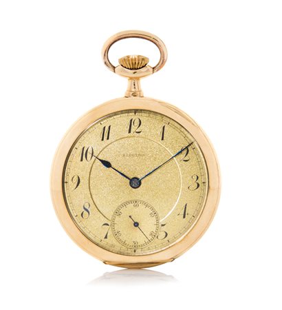 Cassa n. 177052 in oro giallo 18 kt. Quadrante champagne con numeri arabi smaltati e secondi al 6. Movimento con scappamento ad ancora, carica manuale. Quadrante, cassa e movimento firmati.