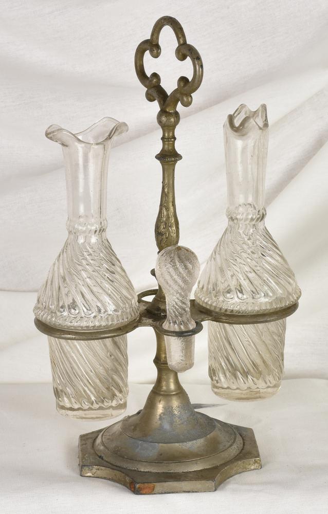 ACETOLIERA in metallo, con ampolle in vetro soffiato Italia, inizio XX sec. h...