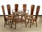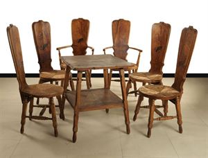 Salotto composto da tavolo, due poltrone e quattro sedie, decoro in marqueterie con varie essenze di legni raffigurante renne nel bosco per il sediame con la seduta di paglia e volatili nel paesaggio per il tavolo.Epoca 1885-86