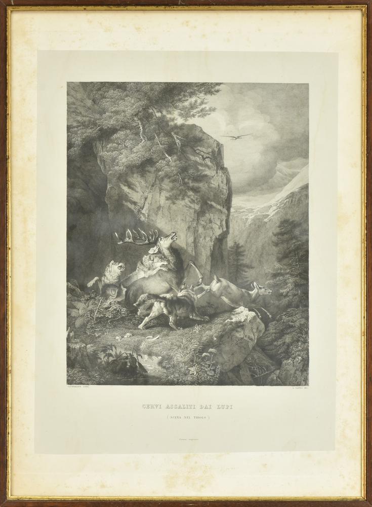 Pinxs Gauermann CERVI ASSALITI DAI LUPI stampa su carta, cm 44x32 L'opera...