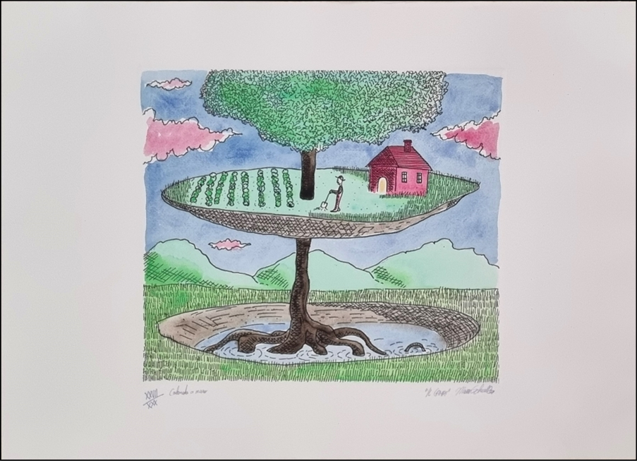 SCHULER MARCO Germania 1972 "Il campo" Incisione su cartoncino colorata a mano cm 70x50. Intitolata e firmata sul fronte in basso a destra, tiratura XXVII/XXX e dicitura "colorata a mano" a sinistra.