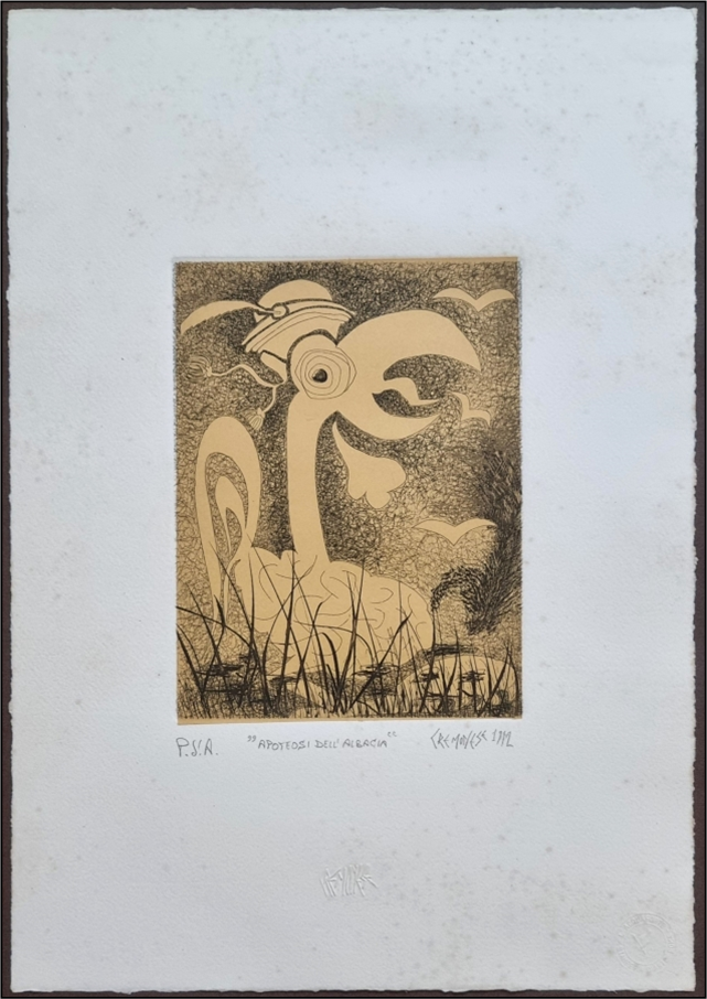 CREMONESE ANTONIO Roma 1949 "Apoteosi dell'Albagia" Incisione serigrafica su cartoncino cm 34,5x50 del 1992. Firmata e datata sul fronte in basso a destra, intitolata al centro, tiratura P.d.A. a sinistra. (Presenta fioriture).