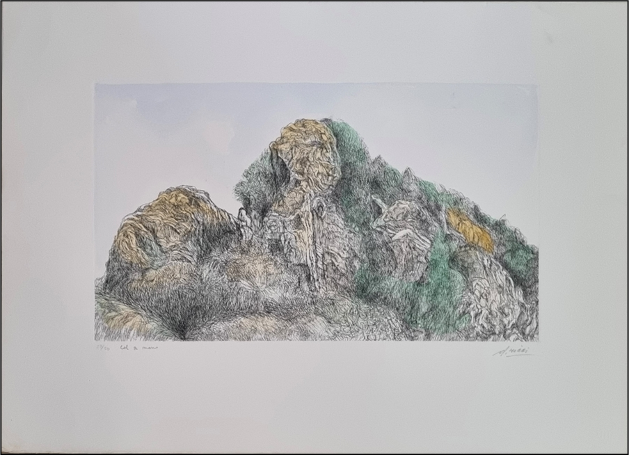 RICCI ANTONIO Frosinone 1943 "Senza titolo" Incisione su cartoncino colorata a mano cm 70x50. Firmata sul fronte in basso a destra, tiratura 28/50 e dicitura "colorata a mano" a sinistra.