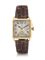 Cassa carrè galbè in oro giallo 18 kt con anse fisse. Quadrante argentato con numeri arabi smaltati e secondi al 6. Movimento a carica manuale. Quadrante, cassa e movimento firmati.