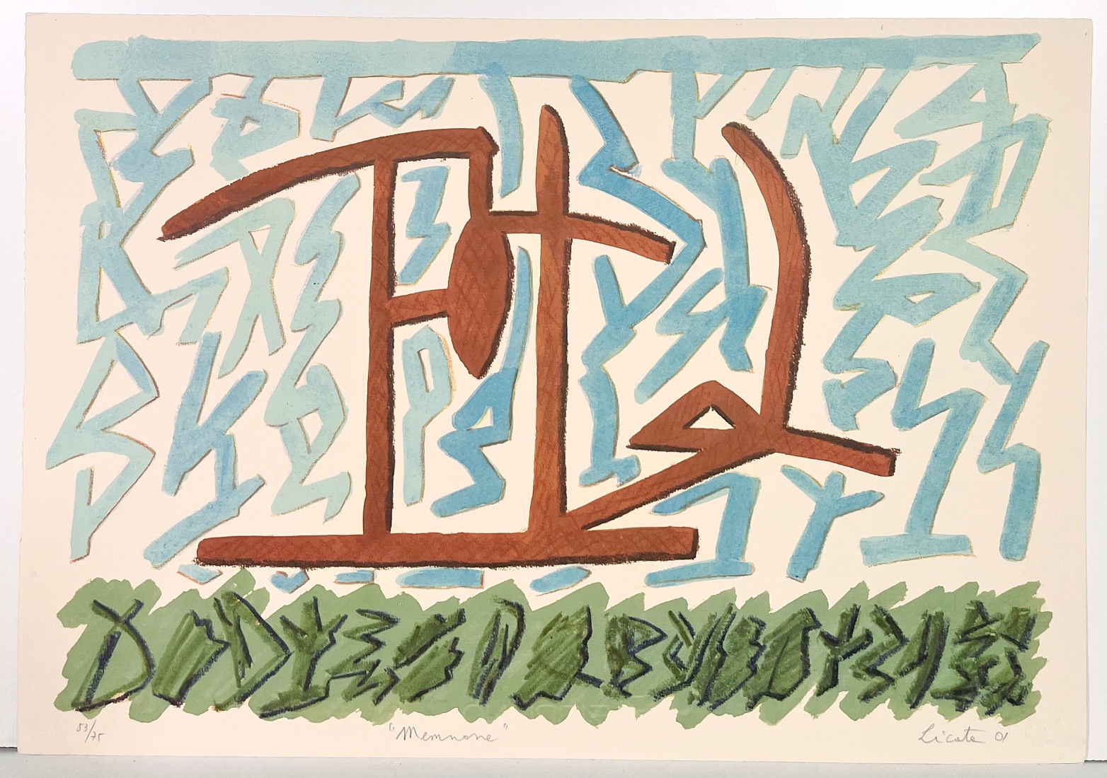 LICATA RICCARDO Torino 1929 - Venezia 2014 "Memnone" Litografia a colori cm 49x34 del 2001. Firmata e datata sul fronte in basso a destra, intitolata al centro, tiratura a sinistra.
