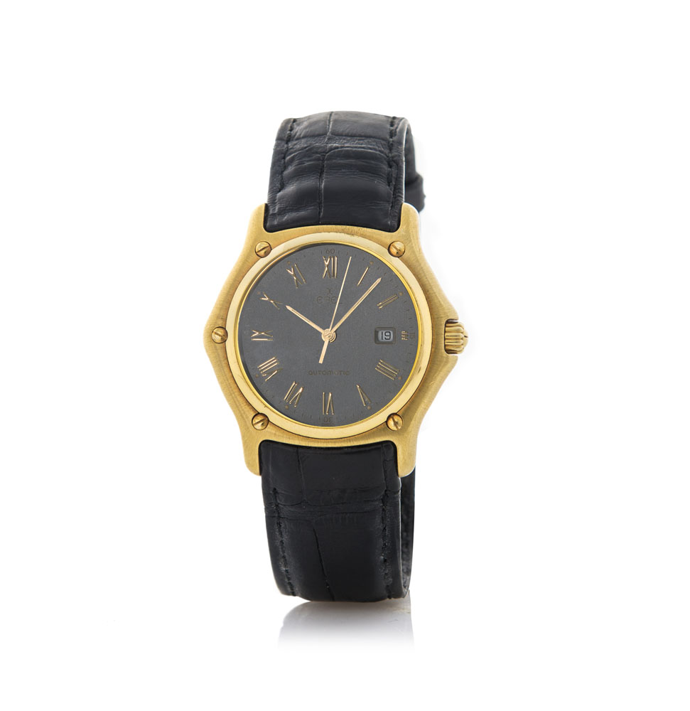 Cassa in oro giallo 18 kt con lunetta e cinturino chiusi da viti alla cassa, vetro zaffiro. Quadrante grigio scuro con numeri romani applicati, secondi al centro e data al 3. Movimento a carica automatica. Completo di cinturino e fibbia in oro giallo originali. Quadrante, cassa e movimento firmati.